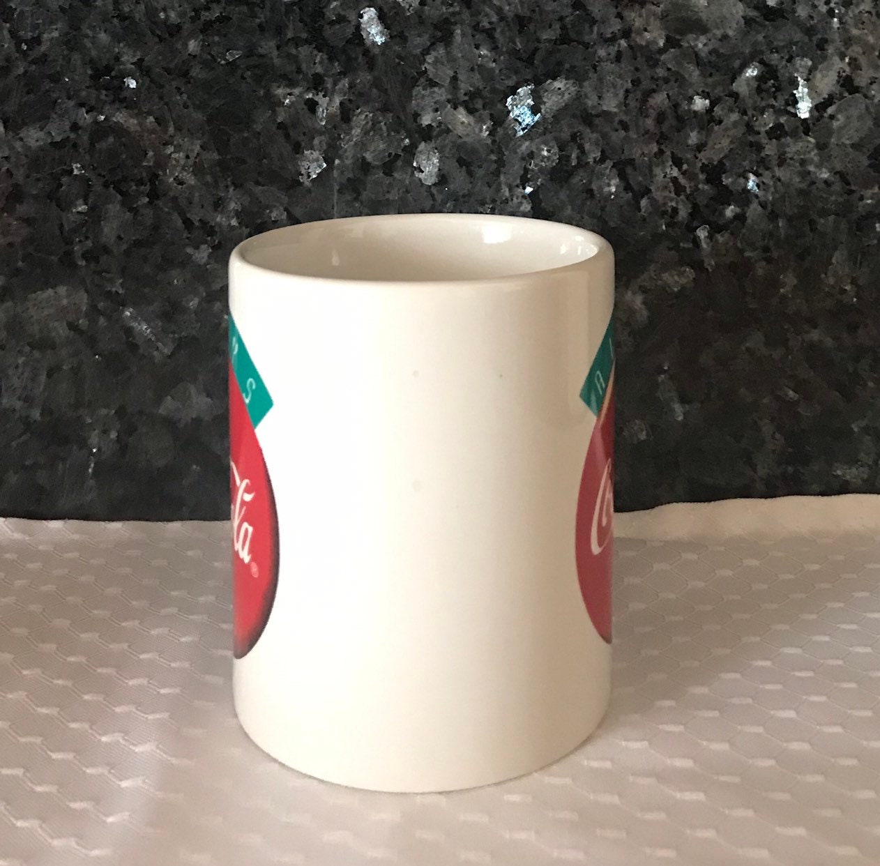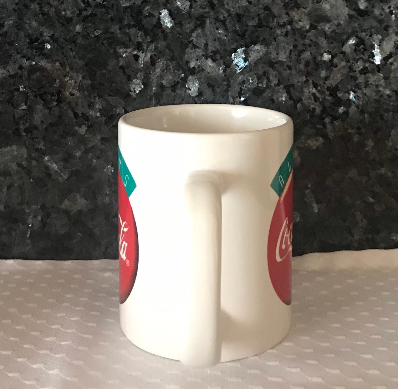This is a vintage Coca Cola mug advertising the “Always Coca Cola” Theme. This is a nice mug for anyone who is a classic Coke or Coca Cola collector. This cup is in good condition it does have two small blue dot specks on the side of the cup. Please see all pics I have circled the area. This mug measures at about 3 7/8” H and 3” in diameter.